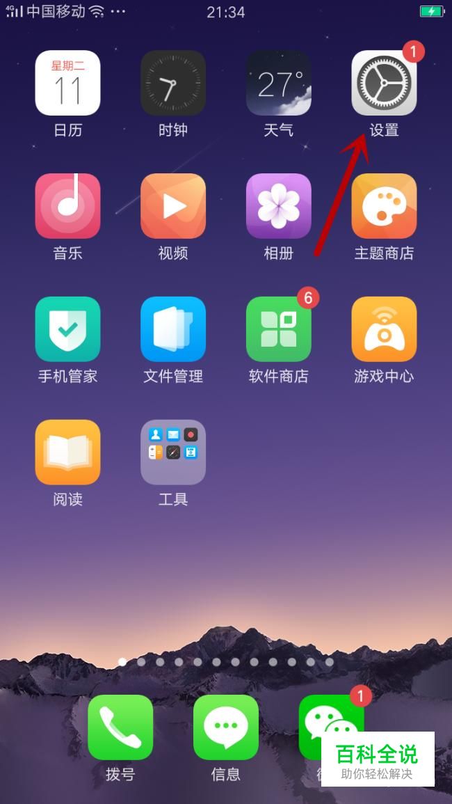 首先我们点击OPPO手机桌面上的“设置”图标,如图所示。