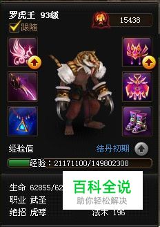 罗虎王与玩家的第一次交锋是在蜀山密道之中,作为虎族之王的罗虎王盘踞于巴蜀之中,为一方霸主。虎族拥有强大的肉体力量,群居的习性,形成了一个强大族群,追求极限和崇尚武力是虎族的信仰和强大的秘密。而罗虎王作为虎族的翘楚能力可想而知。他的绝技是虎啸,对敌方造成绝技伤害并提升自己的暴击率,当玩家声望达到30万,就可以去客栈招募他了。