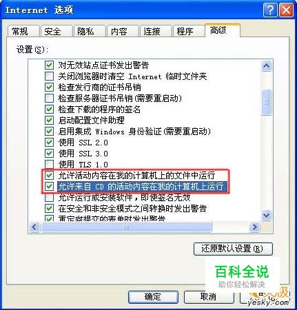 在“设置”下拉列表框中,选择“允许活动内容在我的计算机上的文件中运行”和“允许来自cD的活动内容在我的计算机上运行”复选框(如下图),然后点击“确定”按钮即可。