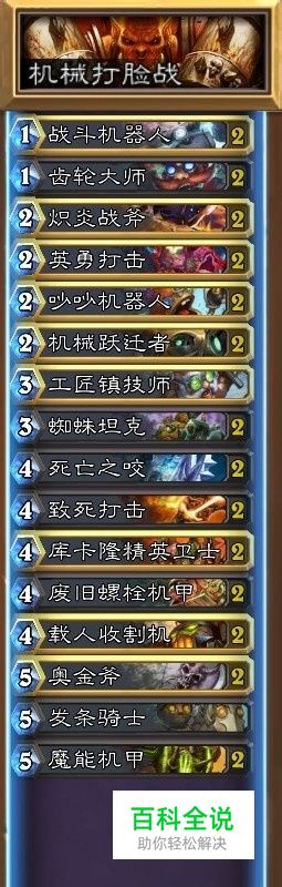 换牌:吵吵机器人,战斗机器人,齿轮大师,机械跃迁者。对抗快攻起手留小斧子,工匠镇技师。对抗控制起手留蜘蛛机器人和工匠镇技师