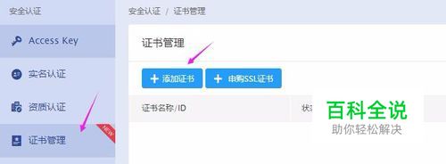 2、点击左上角证书管理,在出现的面板上点击添加证书按钮。
