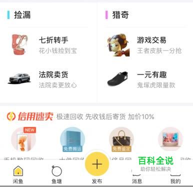 如果是要在闲鱼上卖二手商品,可以点击闲鱼app主页底部的“发布”,选择需要发布的商品类型,可以发布闲置、租房或者信用速卖。