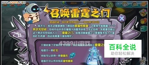 叮叮博士在【狮驼岭】探测到了微弱的雷属性能量,这里很可能隐藏了一个异次元空间,空间内也许存在着强大的雷系妖怪。无论如何,我们都要召唤出这个异次元空间的入口——雷霆之门。但是召唤雷霆之门需要每天投入大量的矿石资源,只要收集了足够的矿石资源,我们就能成功召唤出雷霆之门。每提交一颗矿石,就可以获得一颗雷晶石,雷晶石可以用来购买雷电套装。因此,小卡布们加油啊!