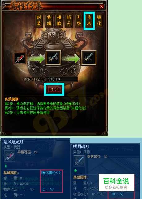 《赤月传说》强化传承的介绍: 《赤月传说》强化传承必须是两件同类型的装备,比如武器只能传承给武器,不能传承给首饰和衣服,男性衣服只能传承给男性衣服不能跨性别传承。传承成功以后,被传承的装备将被赋予传承装备的所有星级品质,传承装备的传承属性消失。