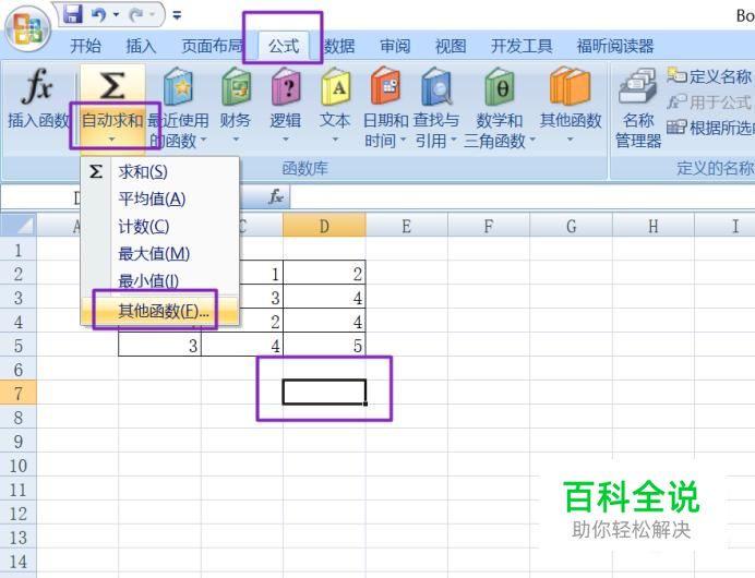 我们任意选择一个单元格,然后点击工具栏中的公式,点击自动求和的下拉箭头,然后点击其他函数;