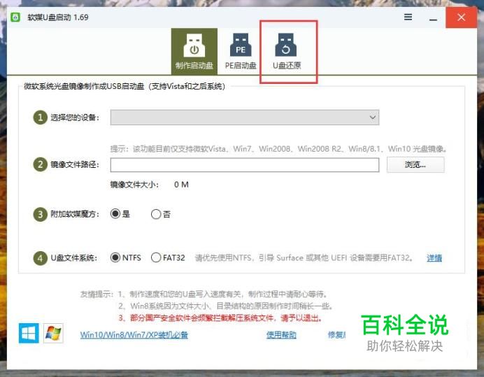 这里以使用软媒U盘启动软件为例,打开软件主页面,点击“U盘还原”功能选项。