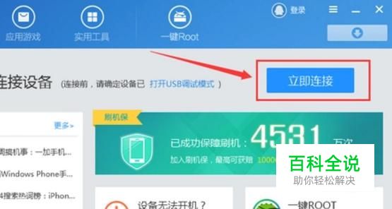 安装完成后打开软件,点击右侧的“一键连接”,同时用数据线连接手机和电脑。