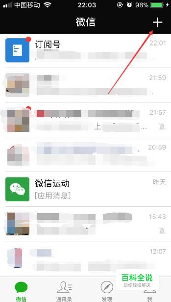 用户想要创建微信群聊,登录手机微信后点击主页右上角的“+”。