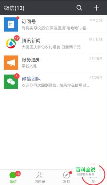 打开你的微信app,主界面右下角点击“我”。