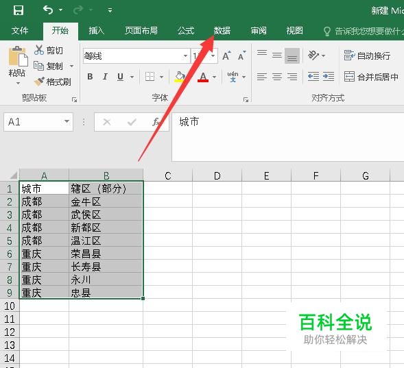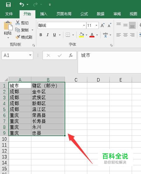 发现所有空值被选中,点击菜单栏的开始,然后合并后居中。