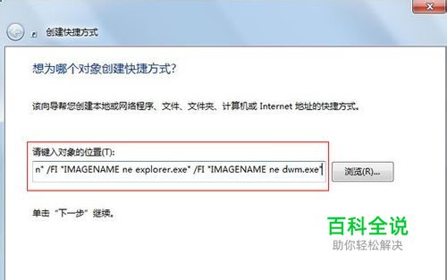 新建完成,会自动弹出创建快捷方式对话框,在对象位置输入:taskkill /F /FI "USERNAME eq admin" /FI "IMAGENAME ne explorer.exe" /FI "IMAGENAME ne dwm.exe",注意,admin要填写自己电脑的当前账户名称,否则无效!