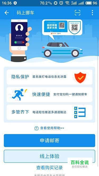 小编最近在支付宝中找到了一个“码上挪车”的功能,用户可以在应用中申请二维码放置在车内,当有人需要挪动车辆的时候,就可以通过扫描二维码来进行联系。