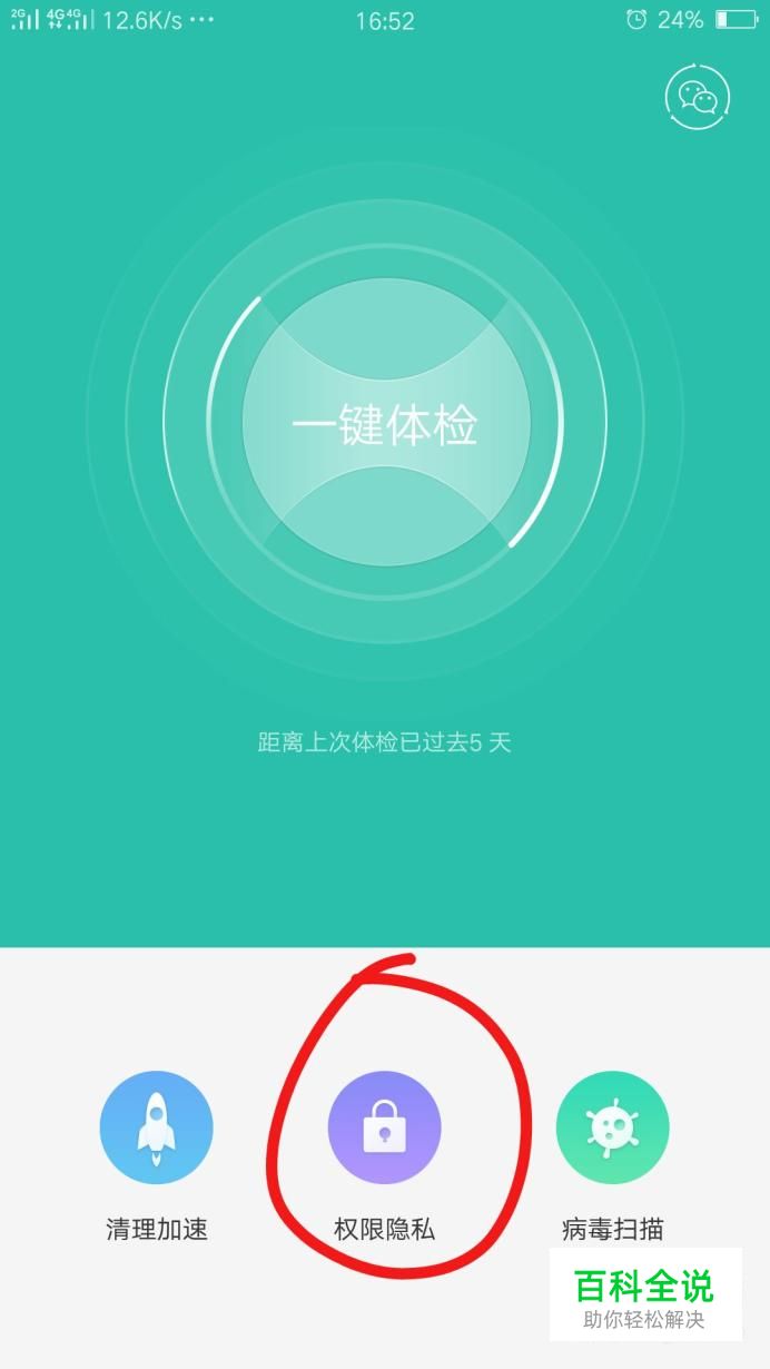 点进手机管家后,它的主页面有权限隐私选项,点击