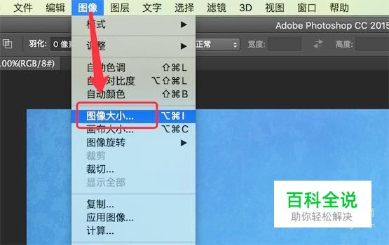 打开photoshop,打开需要处理的图片,然后点击菜单上的‘图像’-->‘图像大小’