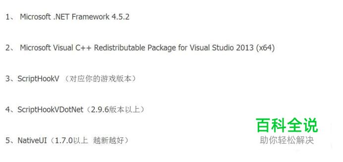 Microsoft .NET Framework 4.5.2 Microsoft Visual C++ Redistributable Package for Visual Studio 2013 ScriptHookV (对应你的游戏版本) ScriptHookVDotNet(2.9.6版本以上) NativeUI(1.7.0以上 越新越好) 下载必要的游戏工具和插件