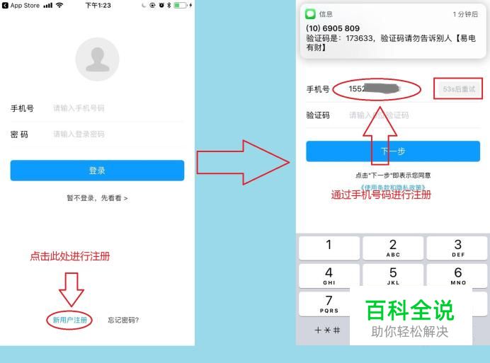 点击新用户注册,使用手机号码获取验证码并填写相关资料进行注册;