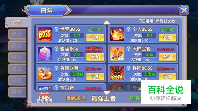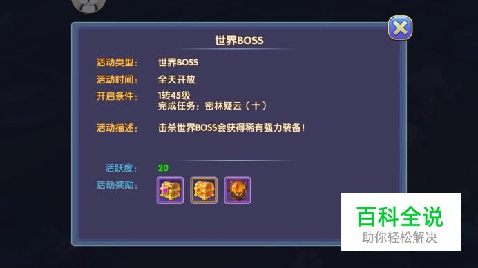 进入游戏日常活动界面,点击“世界BOSS”参加,每日可参加3次,完成后获得20点活跃度。