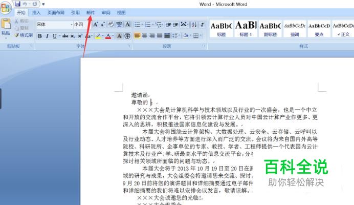找到自己要编辑的文档,打开后进入word文档主页面,在页面上方的菜单栏中找到邮件选项,点击进入。