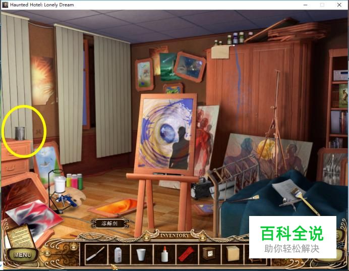 进入画家的屋子,左边罐子里放入水和溶剂,再放入布,收起来,然后将取到的罐子倒在画架上,用布搽干净,看到图上显示的图。