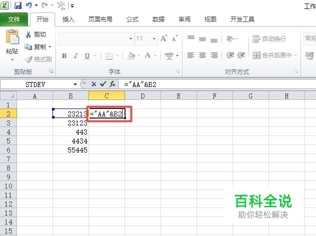 之后我们在第一个数字后面的单元格中输入="AA"&B2,然后我们按回车键;