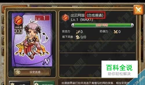最近有很多武士朝代的玩家在问:出云阿国这张卡牌有什么用啊?所以小编就给玩家们带来了一篇:武士朝代出云阿国武将卡牌攻略详解。在这篇攻略中,小编会详细介绍“出云阿国”卡牌有什么用,是怎么获得的。希望本篇攻略能给玩家们带来帮助哦!小编正在更新更多的武士朝代游戏攻略,请玩家们期待我们的后续更新! 如图上所示,可以看到”出云阿国“这张卡牌的属性是:攻击力0、防御力0、部下兵数0/0、可升级等级1、消耗量333。也就是说,这张武将卡牌是不能用来出征战斗的。但是,在出云阿国名字的右侧出现了一段”合成普通“的文字。所以这张卡牌是用来给武将合成的”材料牌‘哦!攻略详情请进入下方链接查看