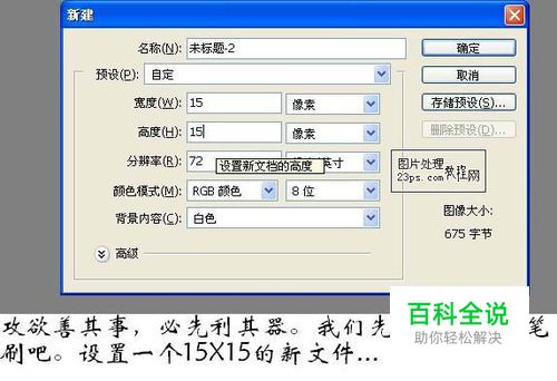 1、工欲善其事,必先利其器。我们先做个简单的笔刷,新建一个15 * 15像素的文档,如下图。