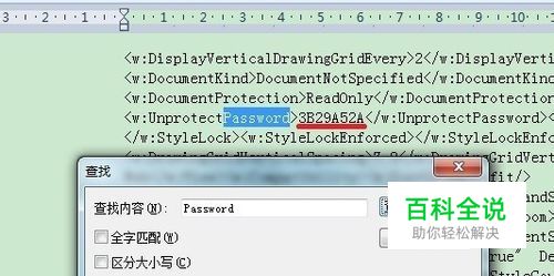 在记事本或写字板中查找(可用快捷键Ctrl+F)“Password”,应能找到这样的的字符串“<w:UnprotectPassword>C782CE28</w:UnprotectPassword>” 中间那8个字符(C782CE28)就是密码了(编译过的),将那8个字符删了然后保存