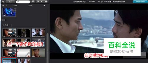 软件左侧里就是添加后的视频或者是扫描后的所有视频,那么就只要点击一下要修正的视频,然后视频就会自动播放了。现在就可以来修正视频了,如果不知道怎么修正的话,可以点击“一键修正”这样软件就会自动修正视频。