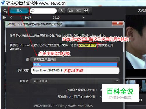 打开运行软件后,在软件主界面的左上方处点击“导入”在源出点击“单击这里来选择源”里的“浏览”然后从电脑中的文件夹选择需要修正的视频进去,或者可以点击“文件夹管理器”让软件扫描指定文件夹中的视频。
