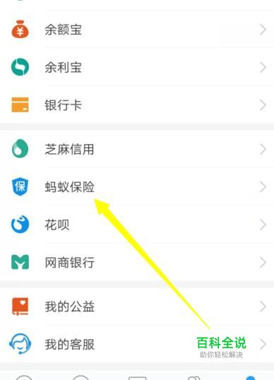 进入之后,在“我的”页面找到“蚂蚁保险”,进入下一页面,如图所示。