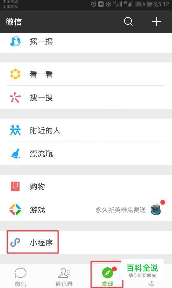 首先,我们打开我们的微信,然后我们点击发现,之后我们点击小程序;