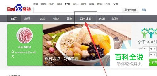首先我们要进入百度经验首页,然后点击导航栏的“回享计划”按钮。