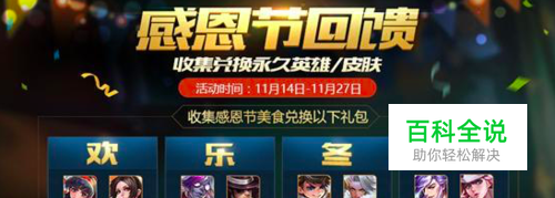 首先就是日常登录的感恩节美食兑换。美食可以兑换四个字“欢”、“乐”、“冬”、“日”,这四个字对应的奖励如下。另外还有感恩节小礼包,但是建议大家不要兑换,凑齐50个之后兑换字即可。 感恩节礼包:欢,打开后可获得橘右京、不知火舞、娜可露露。已拥有会化为英雄碎片。 感恩节礼包:乐,打开后可获得纽约教父、化身博士皮肤。如果已经拥有则会化为皮肤碎片。 感恩节礼包:冬,打开后可获得刘禅、钟无艳、老夫子、达摩。 感恩节礼包:日,打开后可获得金属狂潮、三太子、潮流仙人、加勒比小姐。 感恩节小礼包:打开必得铭文碎片或钻石。