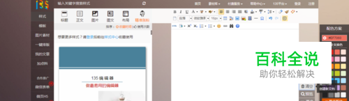 来介绍135编辑器的页面。左侧为工具栏,常用功能是“样式”、“模板”、“图片素材”。中间为编辑板块。右侧为“配色方案”。