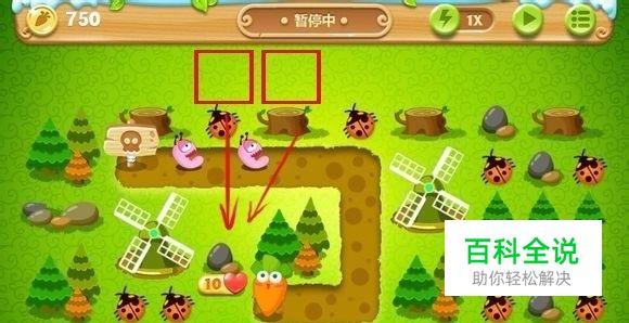 整个战场障碍物较多,所以一般的建在路边是不可行的。现在上面方框内建造两个风扇对准石头进行射击。沿途可以将小怪清干净。等到石头去掉,你会得到一个瓶子炮塔,之后再用瓶子把松树清掉,这时候你就会多出好多太阳,过关就轻而易举了。
