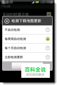 Android手机可以通过主界面的菜单按键,选择“设置”项,进入设置页面,点击“检测下载地图更新”,设置自动检测的时间周期,或立即检测更新,如有更新将提示您下载。