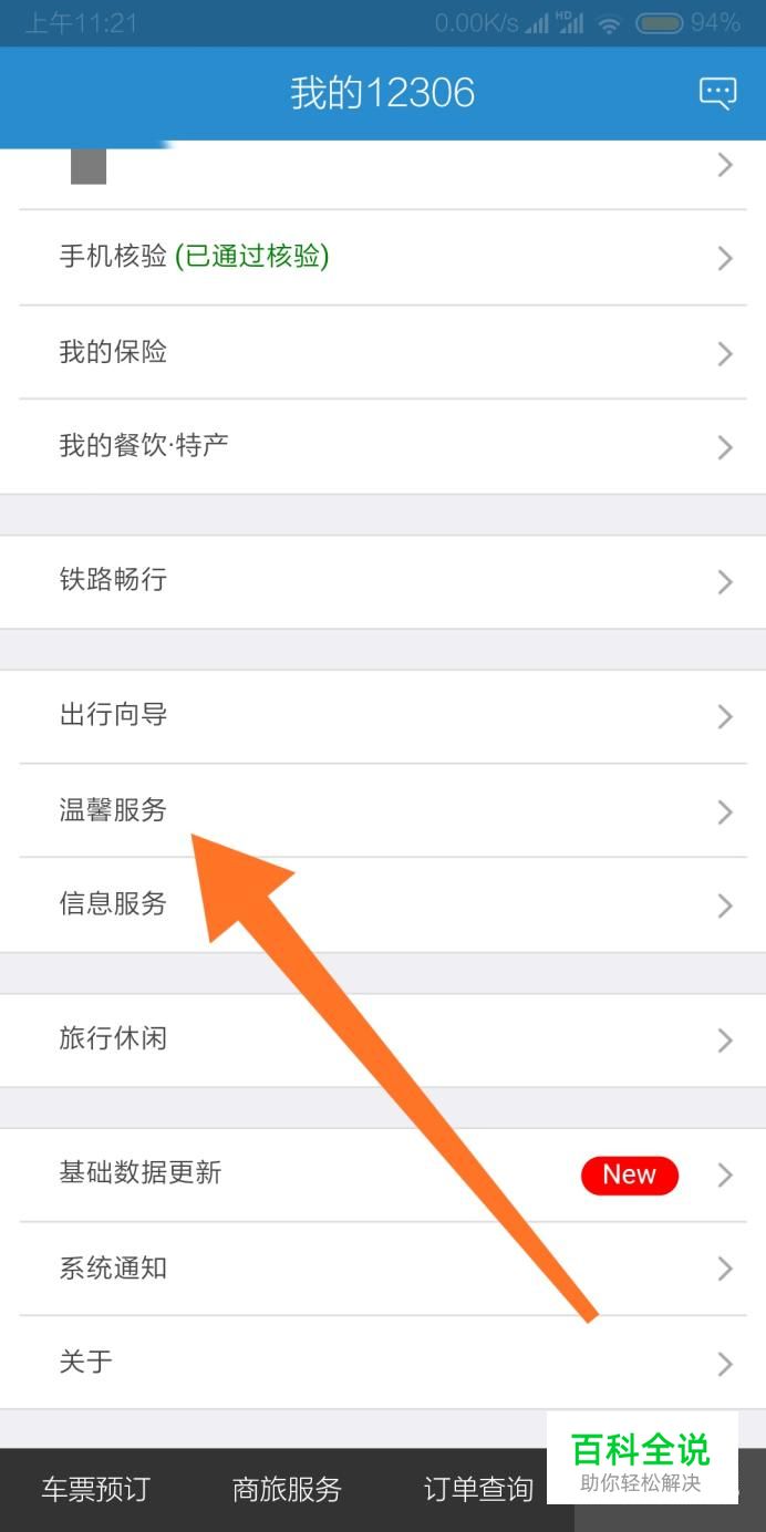 首先点击进入12306“我的”页面,找到“温馨服务”选项,点击进入。