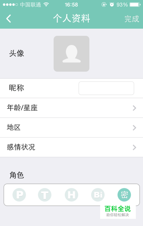 3、授权成功后,填写个人资料并上传头像,然后填写昵称、年龄/星座、地区、感情状况并选择角色,点击完成。