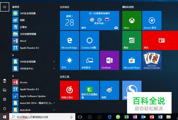 启动Windows 10操作系统,如图所示。点击任务栏"开始"按钮,用于弹出开始菜单。