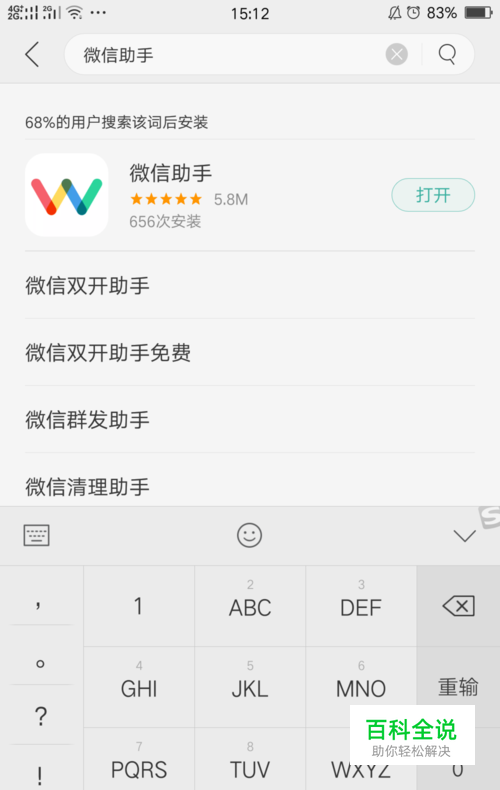 在应用商店搜索微信助手,认准彩虹一样的W字样logo。点击下载安装。
