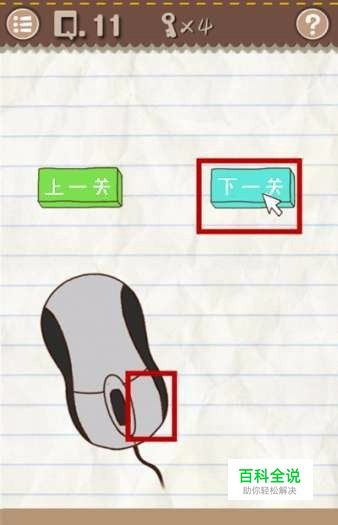 8关 其实这关最左下角是有两只羊的,拖动拉出其中一只,就会发现,最左下角的羊的羊角跟其他羊长得不一样,点击这只羊就可以通关 9关 这关只要把题目上的足球两个字拖动出你的屏幕,就可以通关了 10关 这关使劲摇晃你的手机,就能看见一瓶汽水流出来了,点击该瓶汽水即可通关 11关 这一关你会发现直接点下一关没有用,正确的方法是移动鼠标,当箭头指向下一关的时候,这一关就过了!