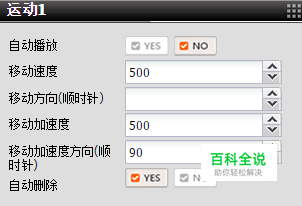 选中中文字体,点击工具栏下的运动工具,中文字体下添加运动。运动与缓动、动效一样,只能添加在实体对象下面。运动没有点对点的限制,是发散的,而缓动是定义了起始和终止的点。运动可以做一些打子弹的效果。设置运动的属性面板,移动速度500,即每秒500像素,移动方向如果是0则往右,加速度500,移动加速度方向90,模拟重力加速度,所以中文字体会模拟抛物线运动。