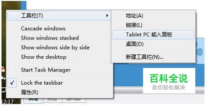 输入法切换不了解决方案三 在任务栏上鼠标右键,在菜单中选择“工具栏-->Tablet PC输入面板”: