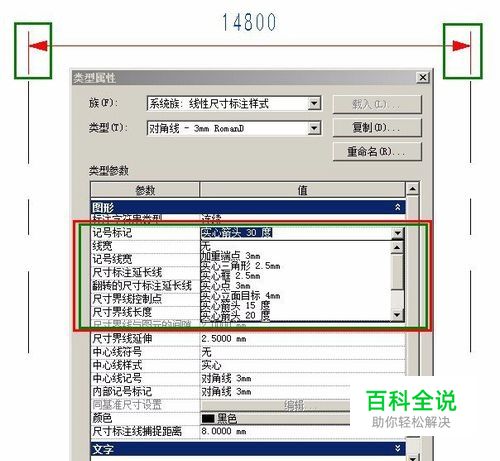 如图所示,可以从下“记号标记”下拉列表中选择需要的样式进行设置,但是有时候该下拉列表中没有满足我们需要的样式的时候该如何处理呢,比如我们需要将“实心箭头45度”的尺寸记号标记。