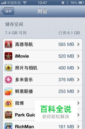 在iOS中,打开设置-通用-用量,稍等一会,最上面的存储空间会显示出目前的的剩余空间,以及已安装应用的占用空间。此列表中,按占用手机存储空间从高至低排列应用。点开之后会显示应用程序大小,下面的“文稿与数据”,则是这个应用中的数据占用的机身存储空间。