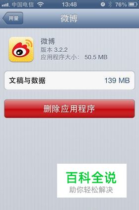 以新浪微博为例,应用程序本身大小50.5MB,文稿与数据139MB,它一共占用了190MB空间。