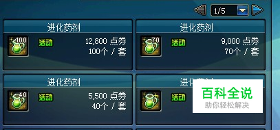玩家也可以在商城中购买进化药剂,以下是进化药剂的价格,在商城中所需要的点券数: 进化药剂 1个 树精宠物进化所需要的材料道具。 每个阶段需要的数量不同。 150点券 进化药剂 40个 树精宠物进化所需要的材料道具。 每个阶段需要的数量不同。 5500点券 进化药剂 70个 树精宠物进化所需要的材料道具。 每个阶段需要的数量不同。 9000点券 进化药剂 100个 树精宠物进化所需要的材料道具。 每个阶段需要的数量不同。 12800点券