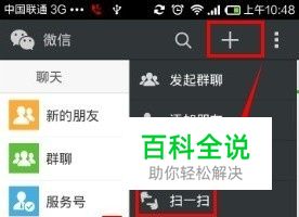 进入微信以后,点击右边的【+】再点击【扫一扫】如下图所示: