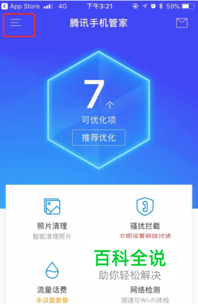 1、打开腾讯手机管家,出现如下页面之后点击左上角按钮。