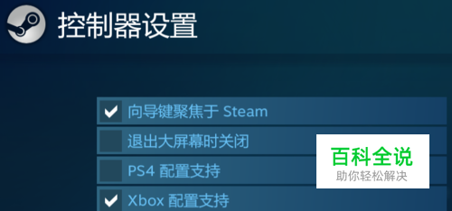 打开Steam设置-控制器设置 有什么手柄就勾选什么,PS4、Xbox、通用手柄,前面打勾后关闭窗口。